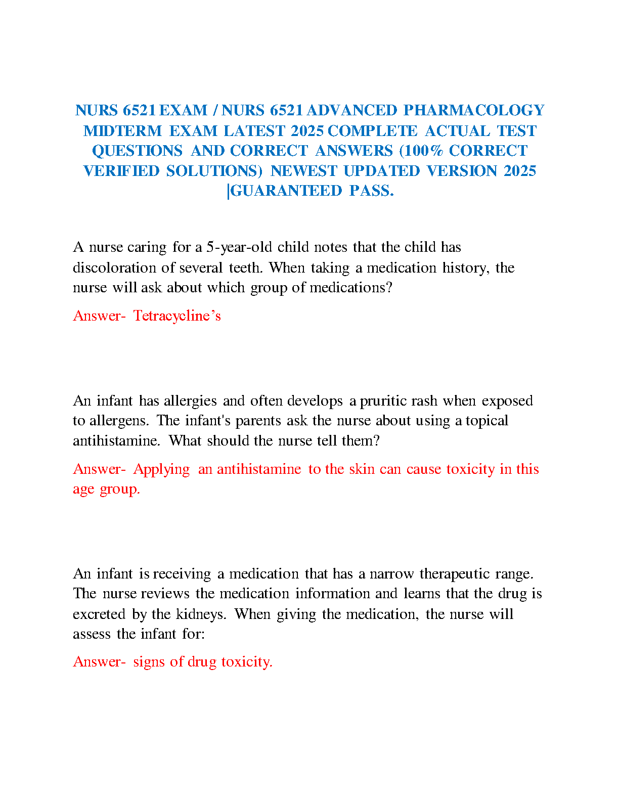 Ace your NURS 6521 Advanced Pharmacology Midterm Exam with this comprehensive study guide. This resource contains 100% correct verified solutions to help you ac...