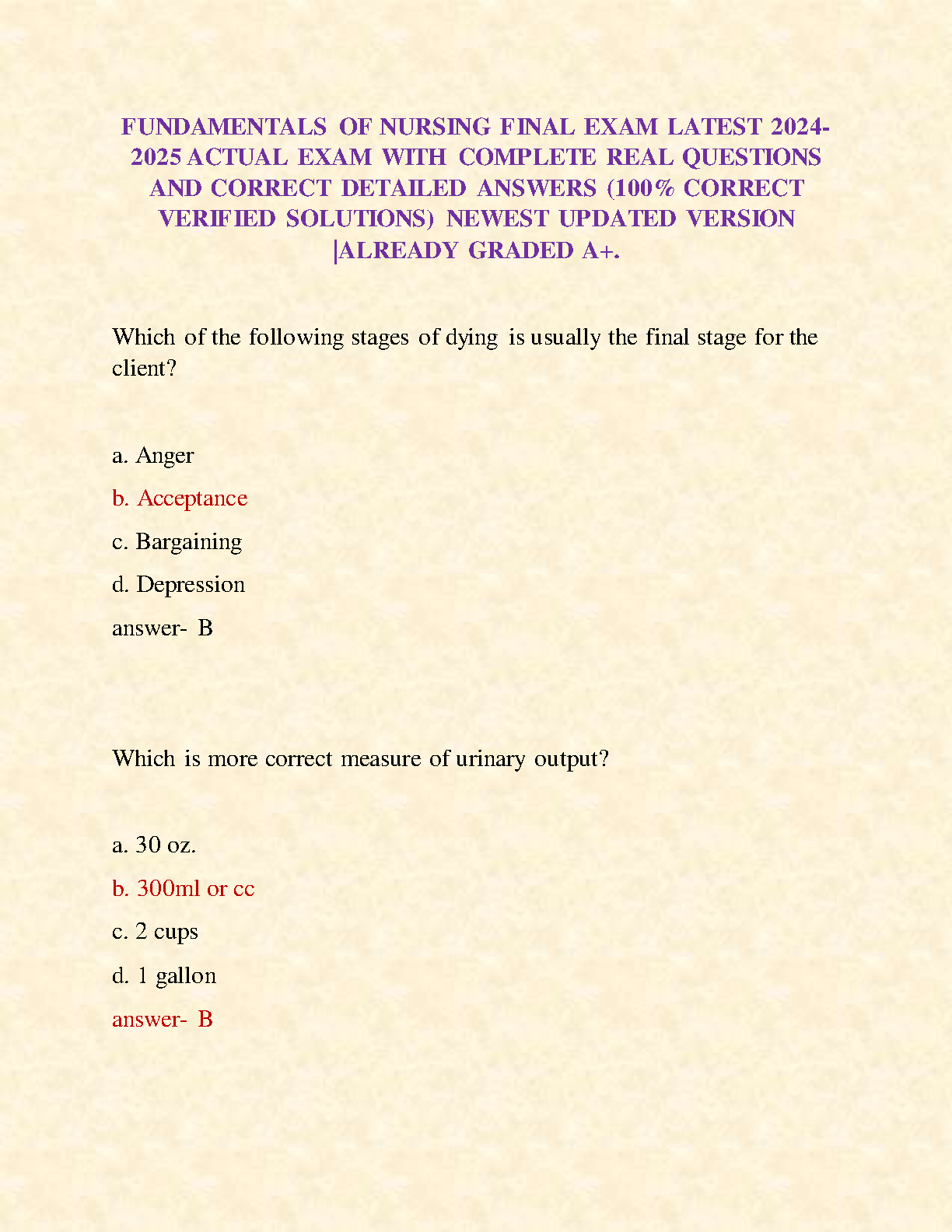 Ace your Fundamentals of Nursing final exam with this comprehensive resource featuring 100% accurate, detailed answers to real exam questions. This newly update...