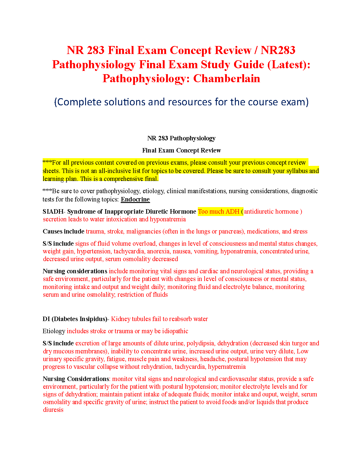 Ace your Chamberlain College of Nursing NR 283 Pathophysiology final exam on your first attempt with this comprehensive study guide. This latest edition (2024/2025) offers complete solutions and resources covering key topics like SIADH and Diabetes Insipidus, ensuring exam success and avoiding resits.