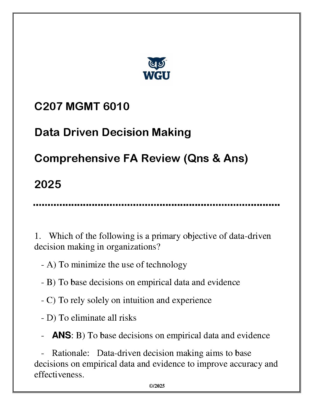 WGU C207 MGMT 6010 Data Driven Decision Making: Comprehensive FA Review (Questions & Answers) - 2025 Edition