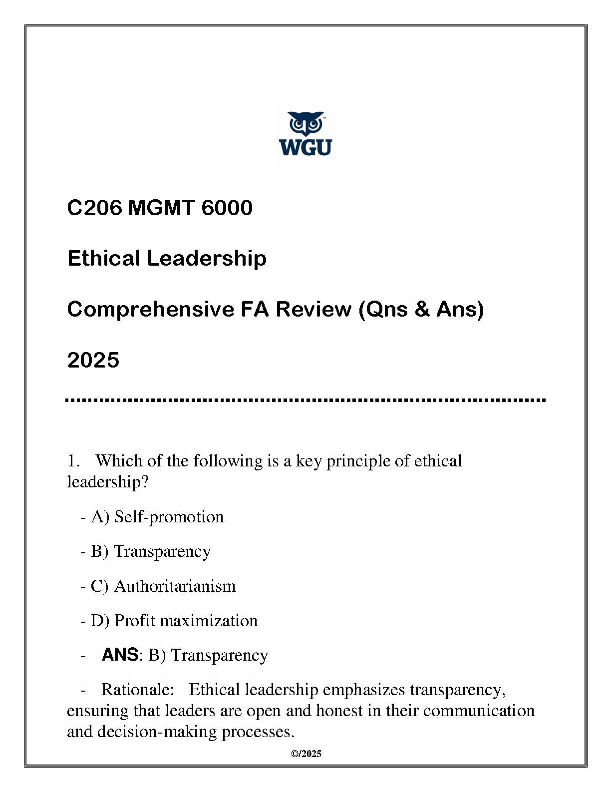 Ace your WGU C206 MGMT 6000 Ethical Leadership exam with this comprehensive 2025 review. This resource provides questions and answers to help you succeed on you...