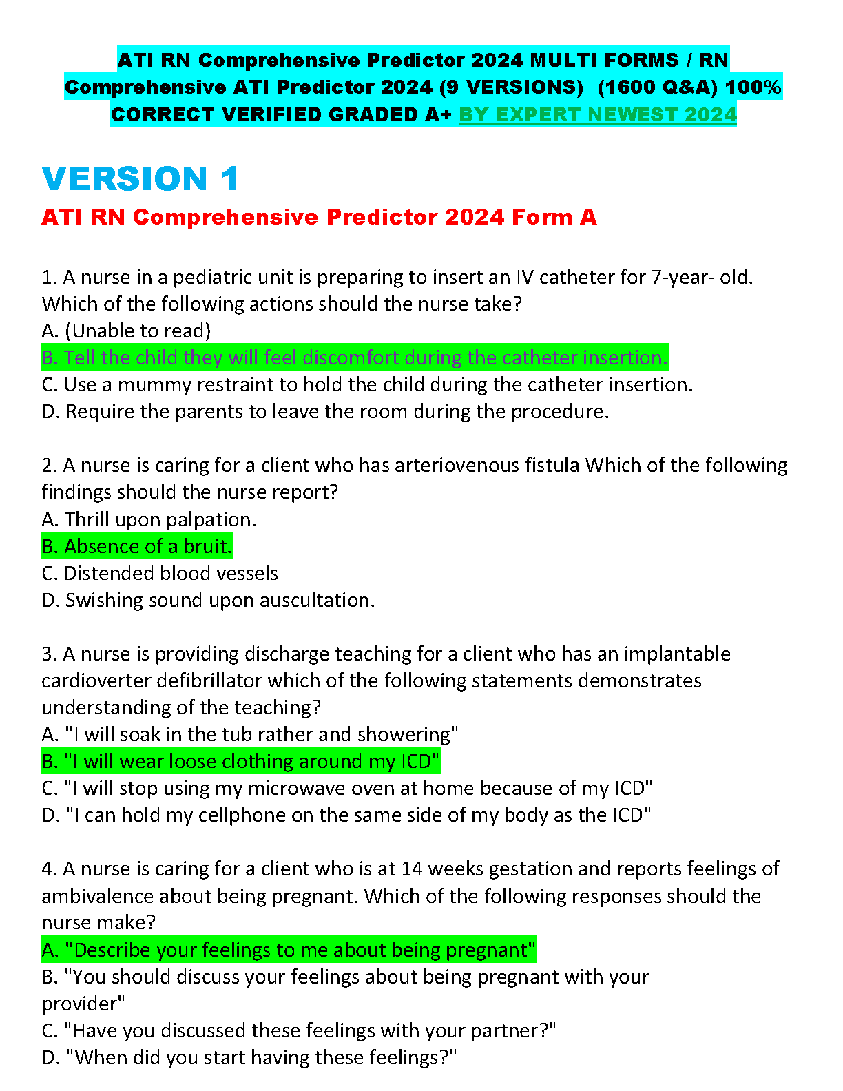 ATI RN Comprehensive Predictor 2024 (9 Versions) Form A: 1600 Q&A - Pass Your Exam on the First Attempt