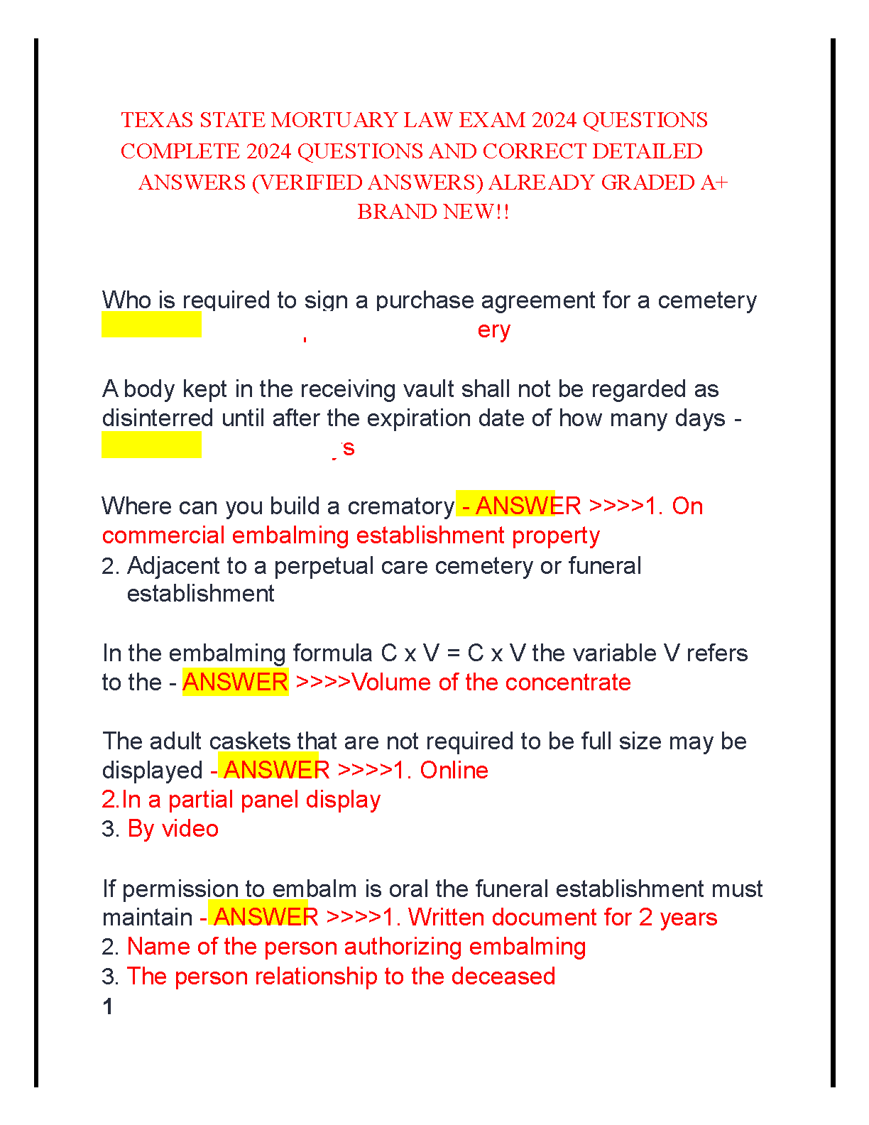 Texas State Mortuary Law Exam 2024 Questions and Answers by [Author Name(s)] - Complete Edition