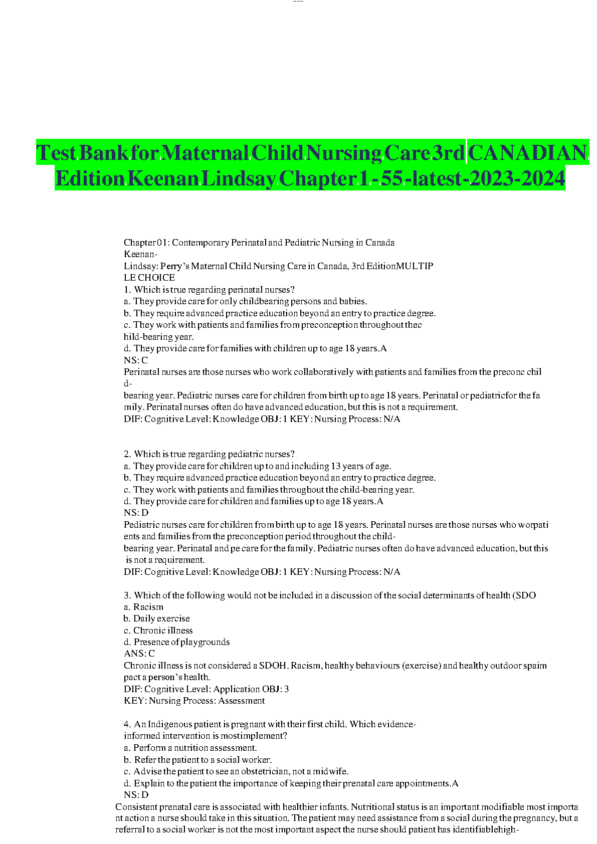This comprehensive test bank covers all chapters (1-55) of Keenan and Lindsay's Maternal Child Nursing Care, 3rd Canadian Edition. Prepare effectively for your exams and avoid resits with this invaluable resource, designed to help students achieve success on their first attempt. The questions are designed to mirror the exam format, allowing for targeted practice and improved understanding of key concepts.