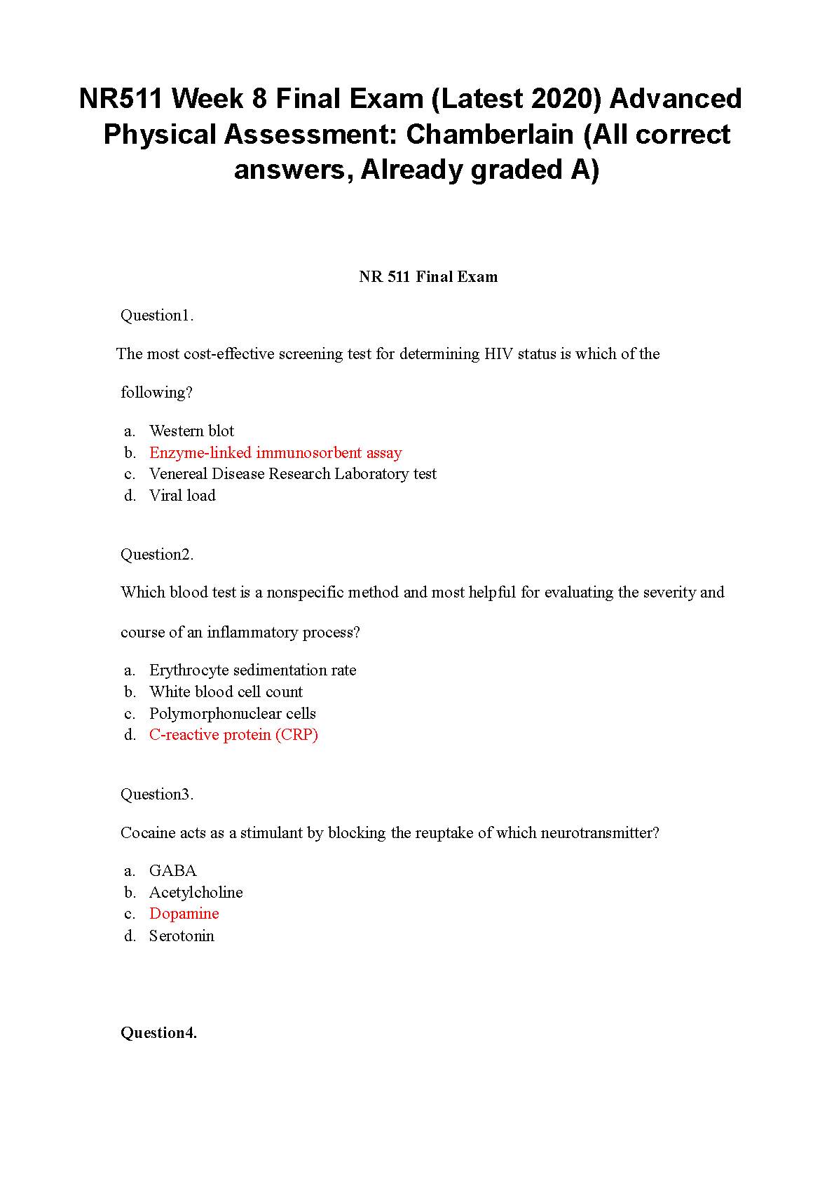 Ace your NR511 Week 8 final exam with this comprehensive solution guide. This resource contains all the correct answers from the 2020 edition of the Chamberlain College of Nursing Advanced Physical Assessment exam, ensuring you achieve an 'A' grade and avoid resits. Prepare effectively and efficiently for exam success.