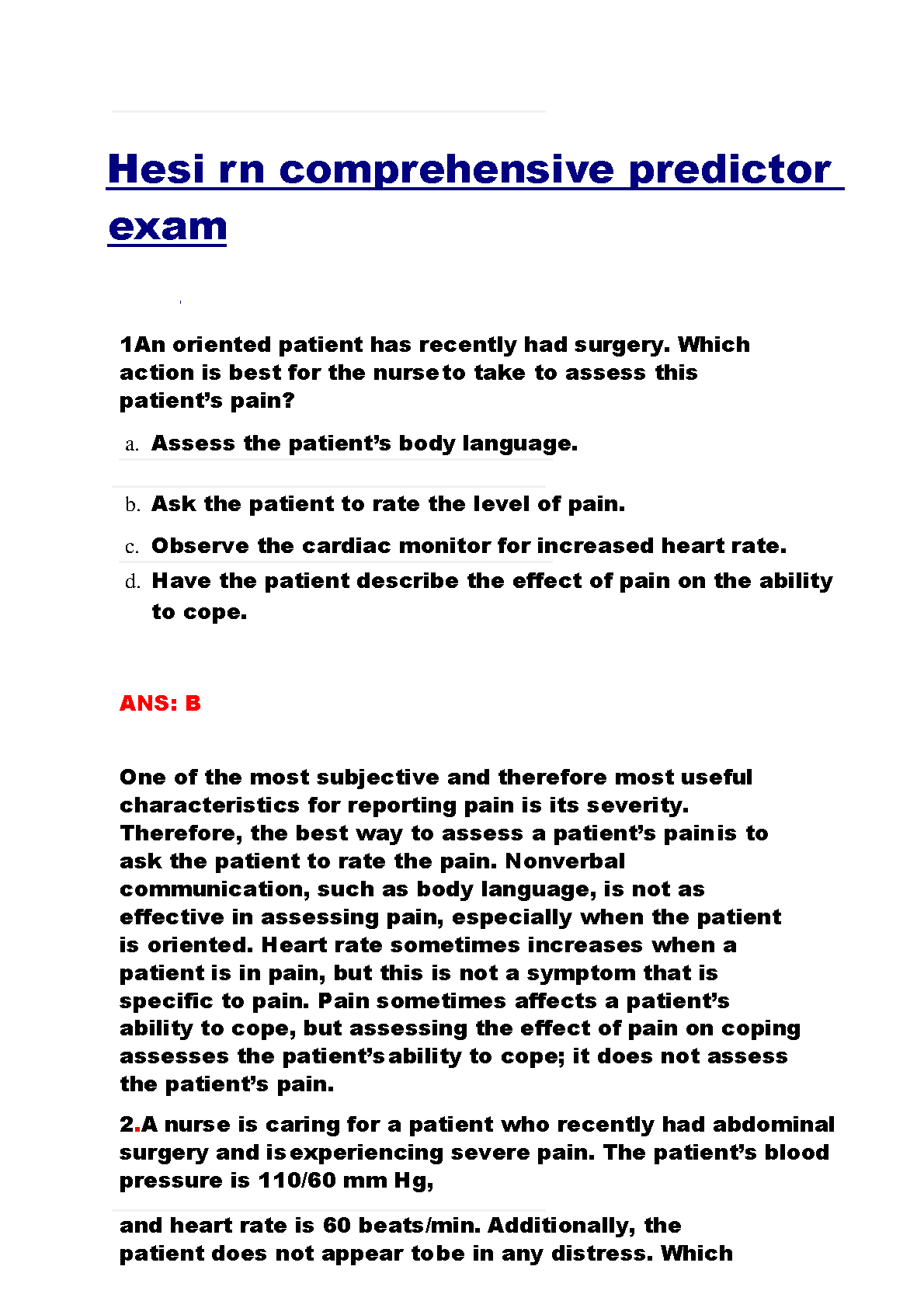 Prepare for your HESI RN exam with this comprehensive predictor exam. This resource helps you identify areas for improvement and boost your confidence for exam...