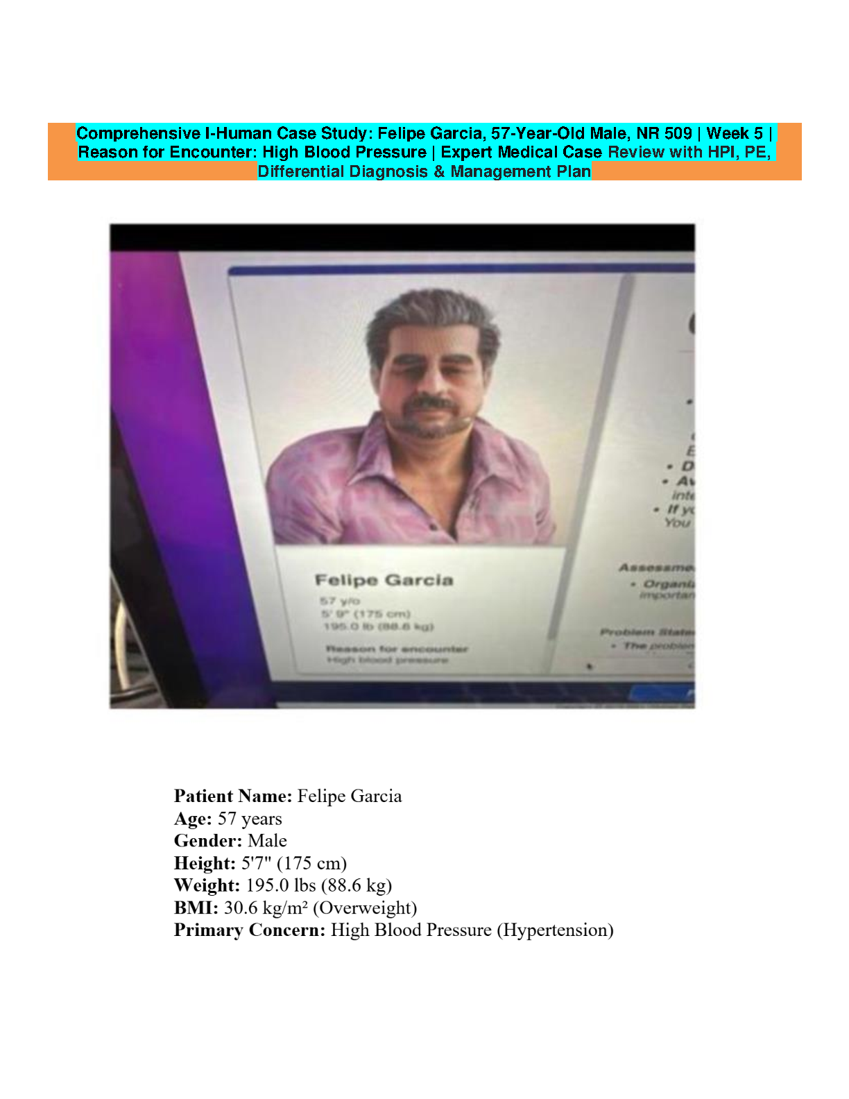 Master the art of differential diagnosis and management planning with this comprehensive iHuman case study focused on Felipe Garcia's high blood pressure. This in-depth resource offers an expert medical case review, perfect for acing your exams on the first attempt and avoiding resits. Ideal for 2024/2025 academic year.