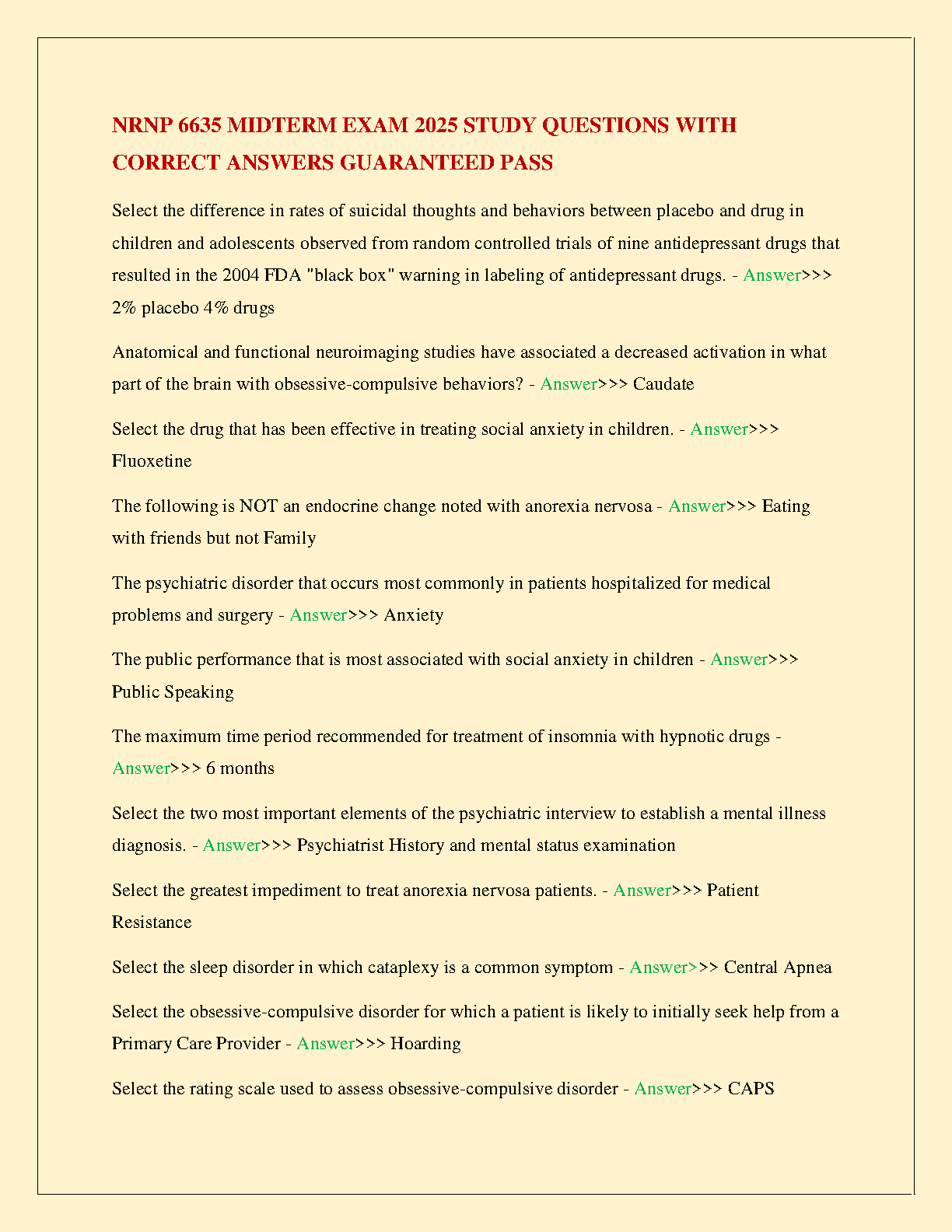 Ace your NRNP 6635 Midterm Exam in 2025 with this comprehensive study guide. This resource provides a curated selection of study questions with guaranteed corre...
