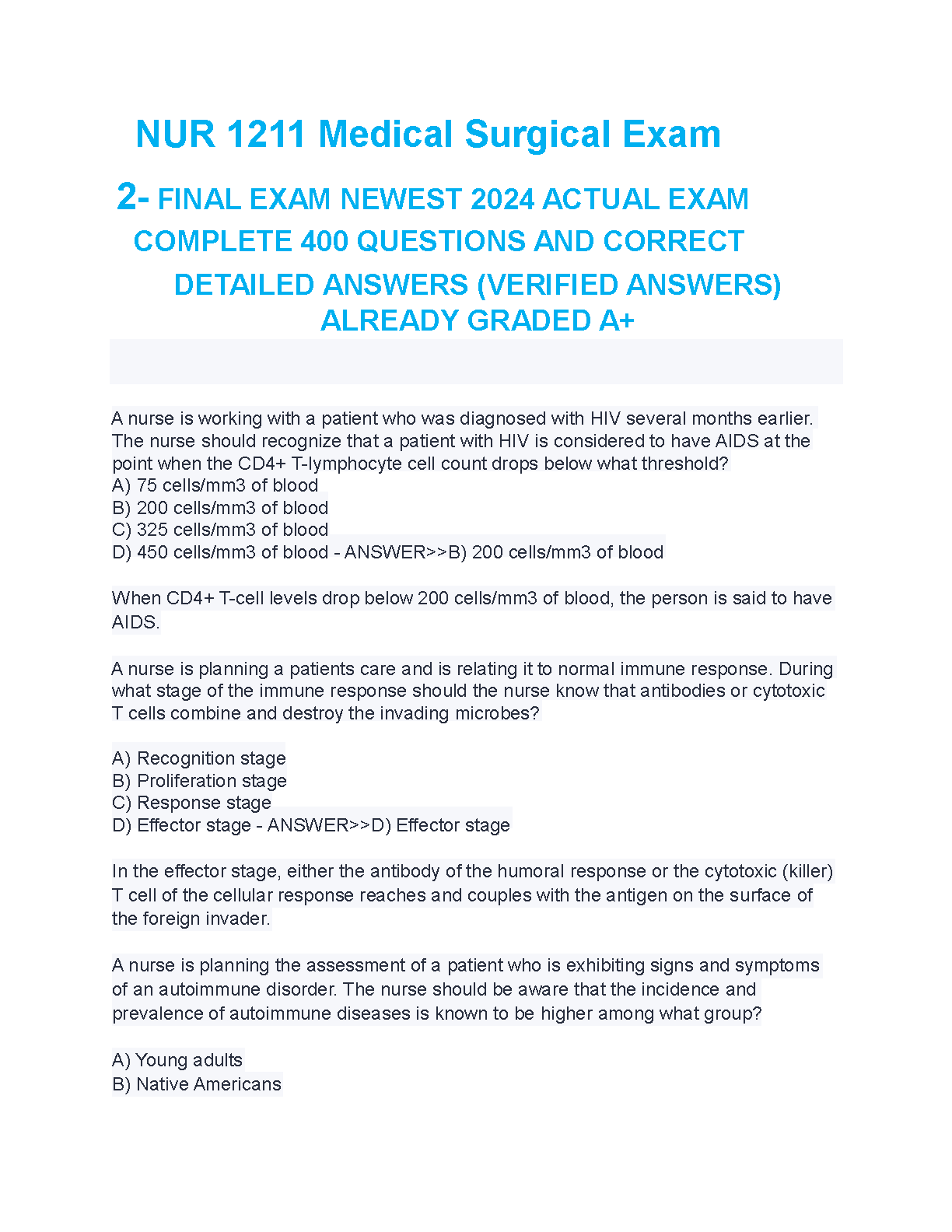 Prepare for your NUR 1211 Medical Surgical final exam with confidence using this comprehensive study guide. Featuring 400 verified questions and detailed answers, this resource is designed to help students achieve an A+ and avoid resits. This 2024 edition provides the most up-to-date content to ensure exam success on your first attempt. Already graded for your convenience.