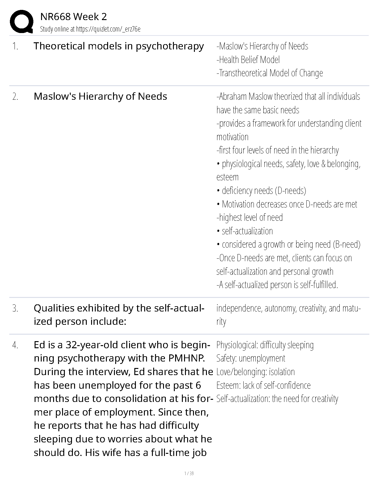 NR668 Week 2: Theoretical Models in Psychotherapy & Maslow's Hierarchy of Needs - 2024/2025 Edition