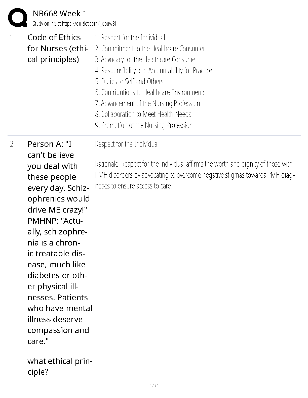 NR668 Week 1: Code of Ethics for Nurses - Ethical Principles and Respect for the Individual