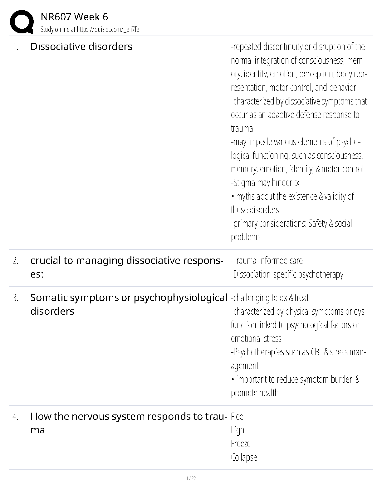 Ace your NR607 Week 6 exam on the first try! This comprehensive study guide covers key concepts in dissociative disorders, somatic symptoms, psychophysiological disorders, and the nervous system's trauma response. Prepare effectively with clear explanations and essential information to avoid resits. Perfect for the 2024/2025 academic year.