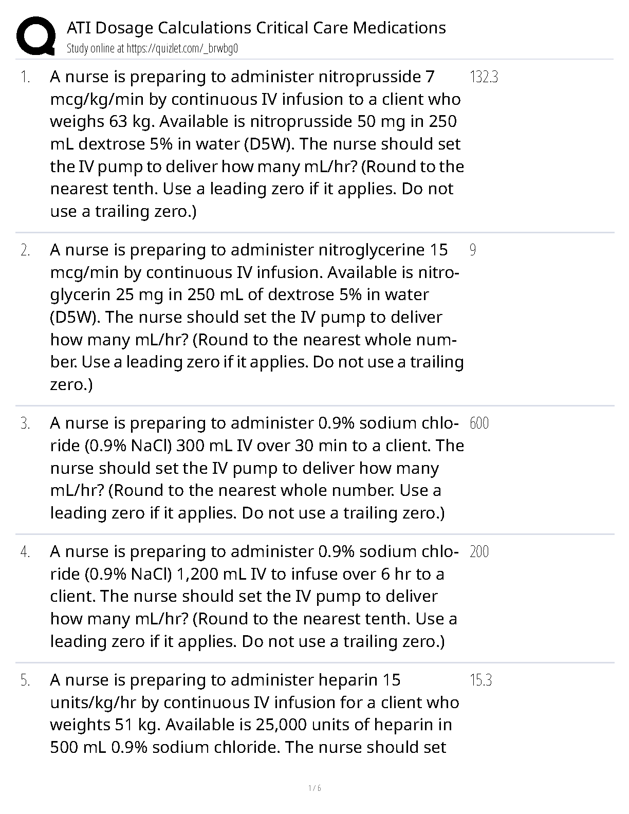 ATI Dosage Calculations Critical Care Medications Practice Questions for 2024-2025