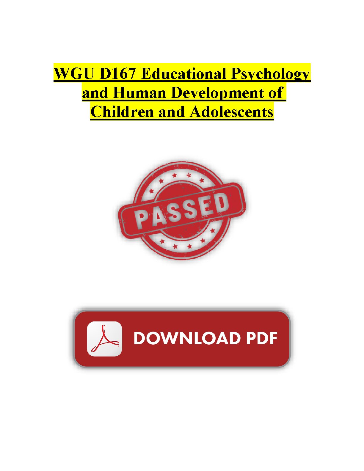 Ace your WGU D167 Educational Psychology and Human Development of Children and Adolescents exam on your first try! This comprehensive study guide is designed to help students master the key concepts and pass with confidence. Updated for the 2024-2025 academic year, it covers all essential topics to ensure exam readiness.