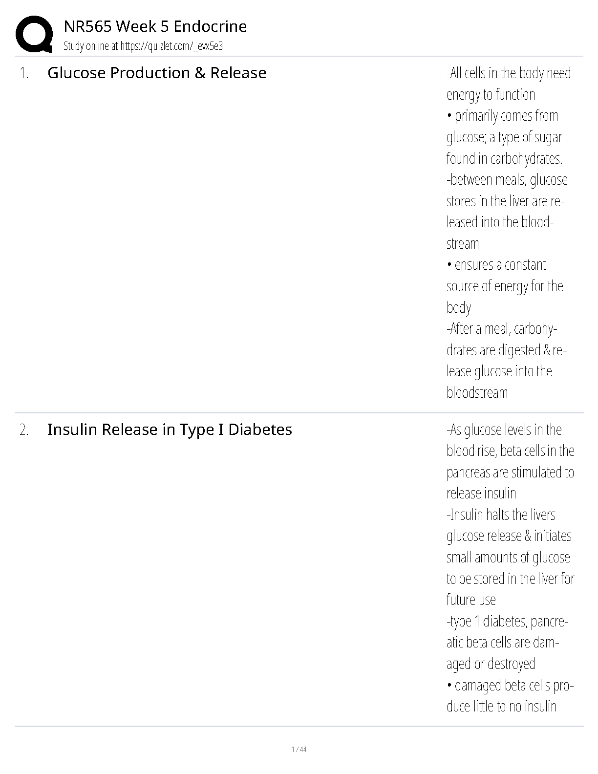 NR565 Week 5 Endocrine: Glucose Production & Insulin Release in Type 1 Diabetes - 2024/2025 Edition