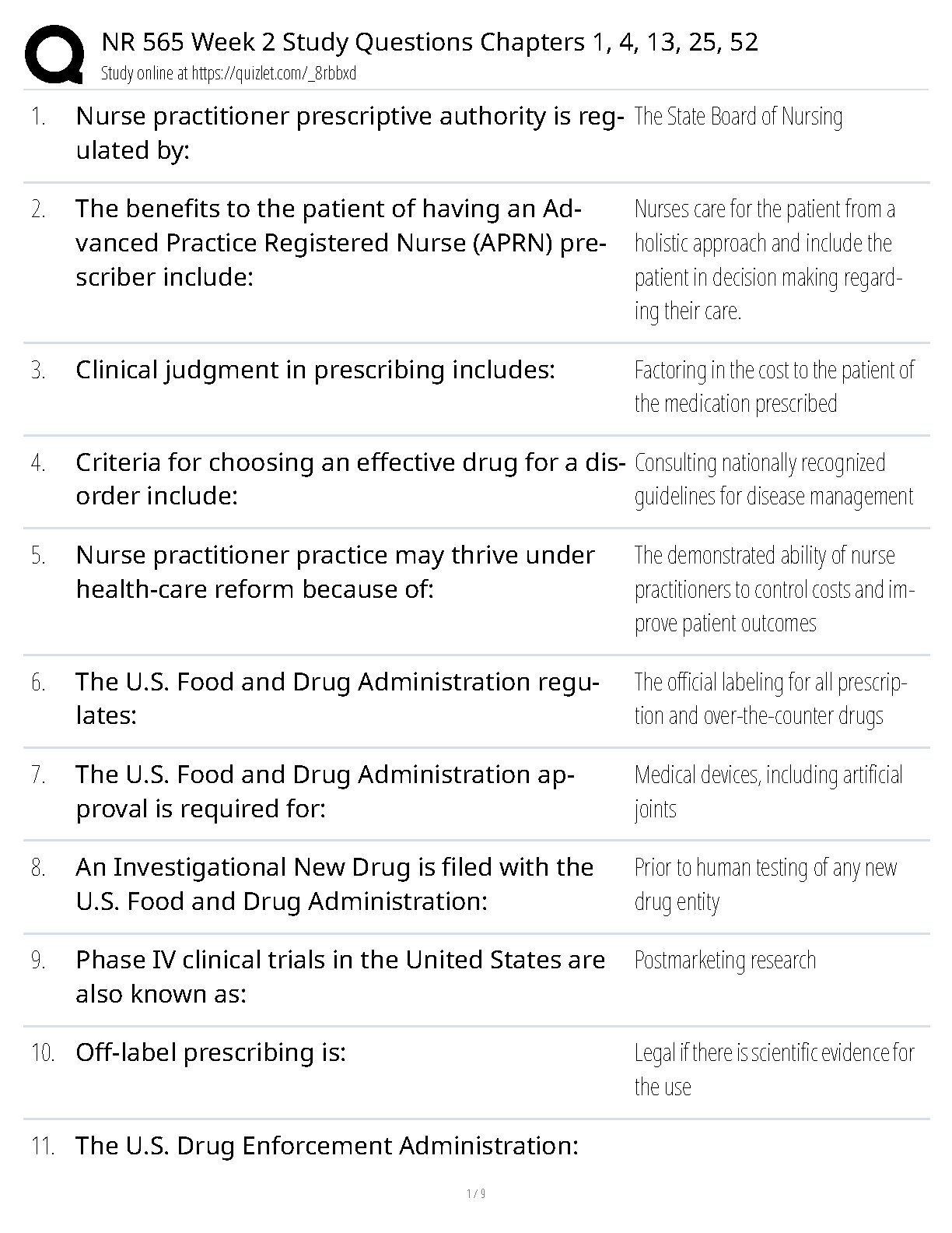 NR 565 Week 2 Study Questions Chapters 1, 4, 13, 25, 52 - 2024/2025 Edition