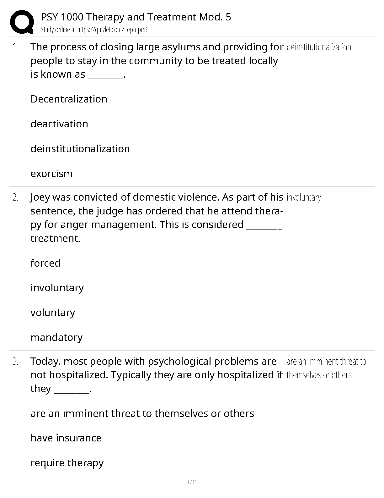 Ace your PSY 1000 exams on the first attempt with these practice questions covering Therapy and Treatment Module 5. These questions are designed to help you und...