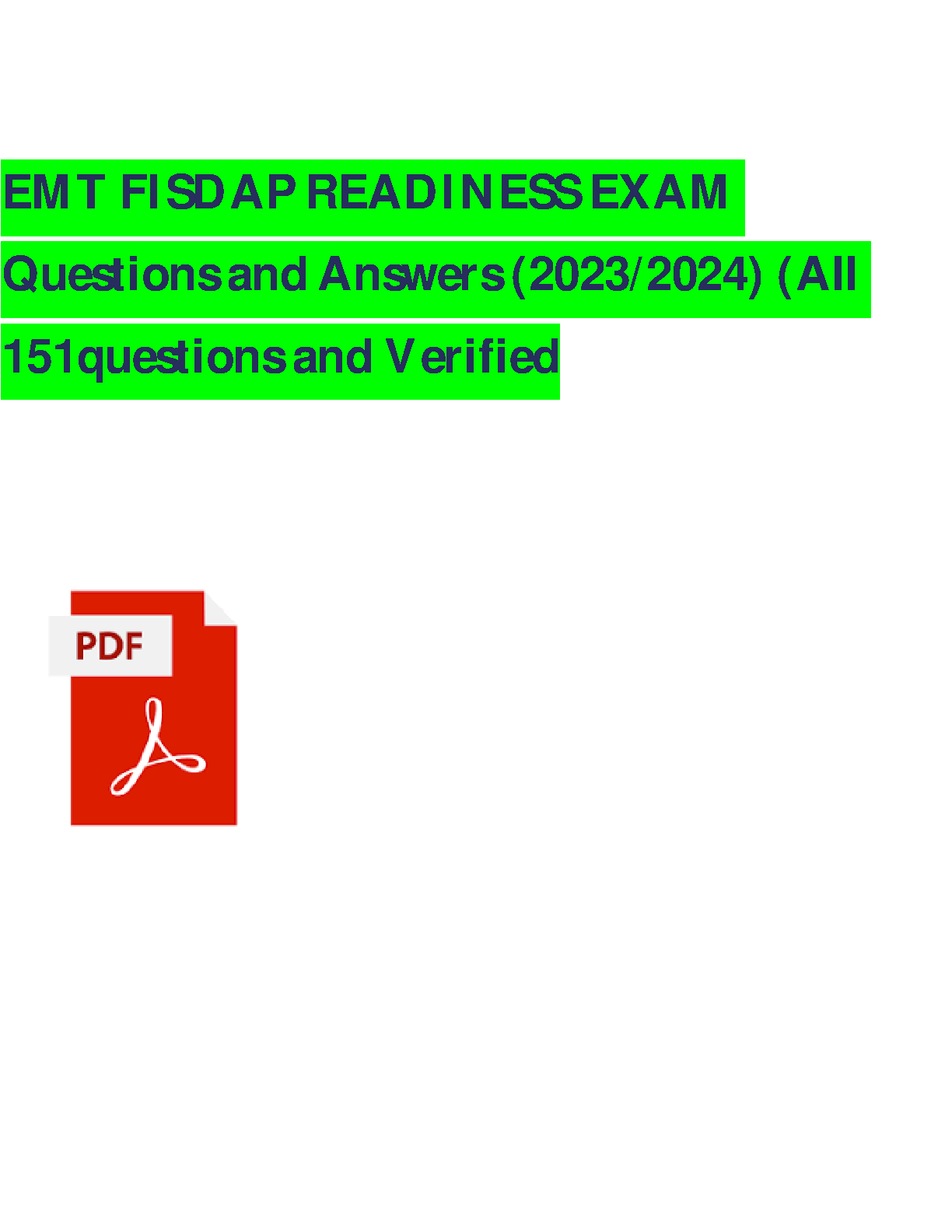Ace your EMT FISDAP exam on the first try with this comprehensive PDF containing 151 verified questions and answers. This resource is designed to help you succeed in your EMT certification and avoid resits. Perfect for the 2024/2025 academic year.