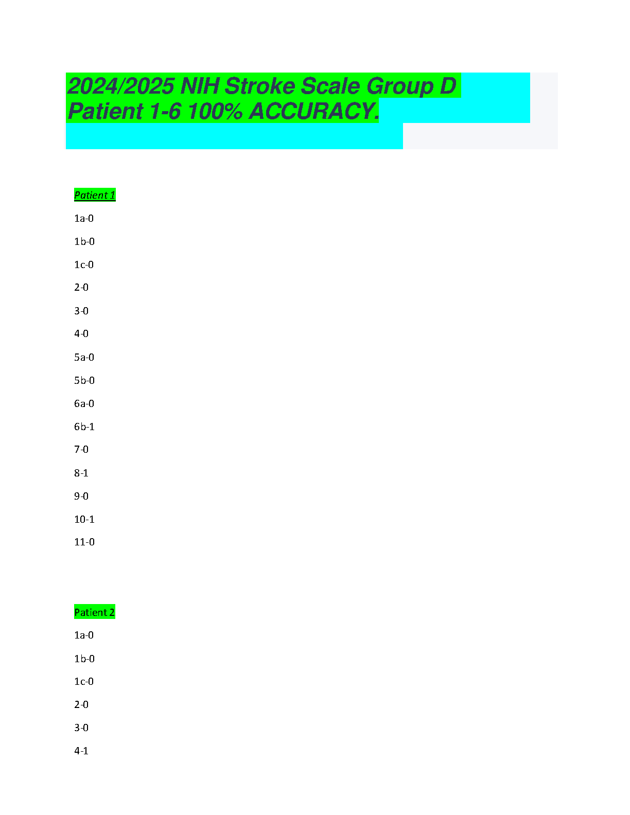 Master the NIH Stroke Scale with this comprehensive guide designed for the 2024-2025 academic year. Practice accurately assessing patients using Group D scenarios for first-attempt exam success. Achieve 100% accuracy in your assessments and avoid resits.