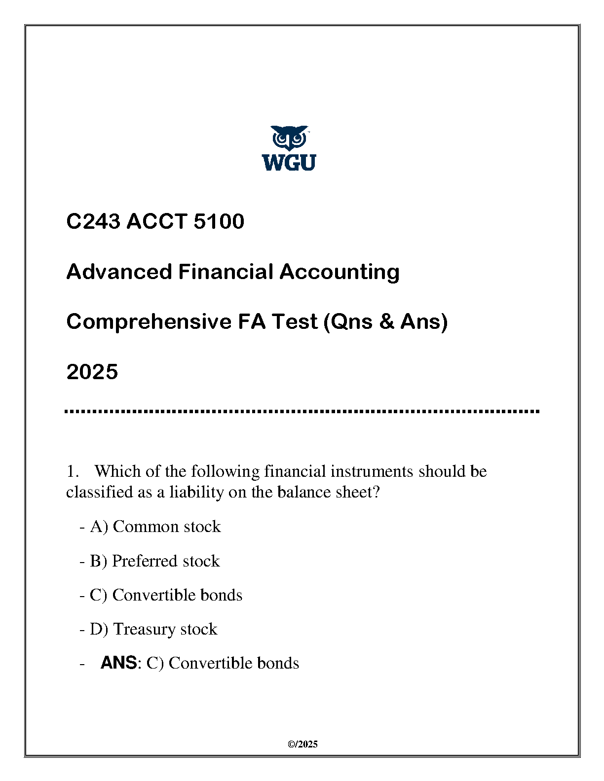 WGU C243 ACCT 5100 Advanced Financial Accounting Comprehensive Test Bank 2025 Edition