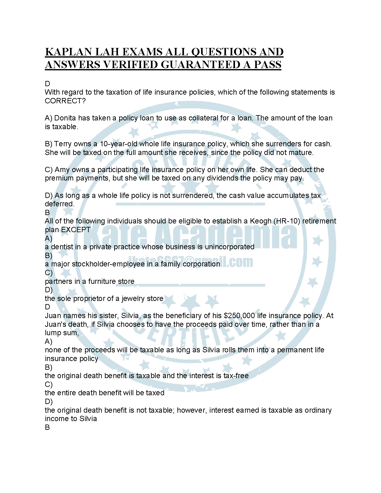 Kaplan LAH Exams: All Questions and Answers (Verified Guaranteed Pass)