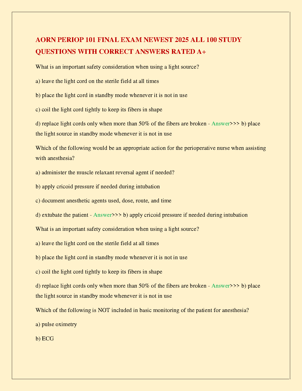 Ace your AORN Periop 101 final exam with this comprehensive study guide featuring 100 questions and answers, designed to help students pass their exams on the f...