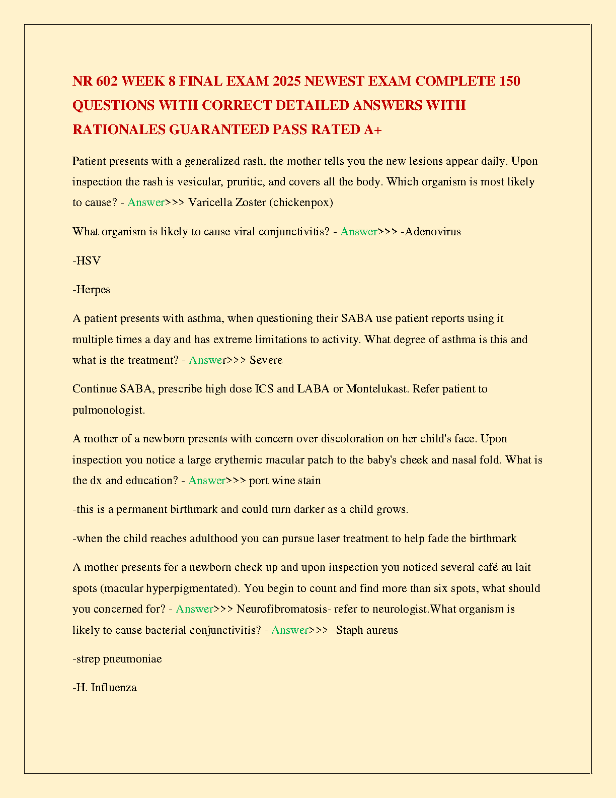 Ace your NR 602 Week 8 Final Exam in 2025 with this comprehensive study guide. This resource features 150 complete questions with detailed answers and rationale...
