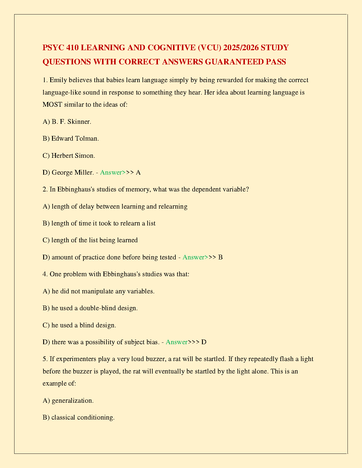 PSYC 410 Learning and Cognitive (VCU) 2025/2026 Study Questions with Correct Answers by [Author Names]