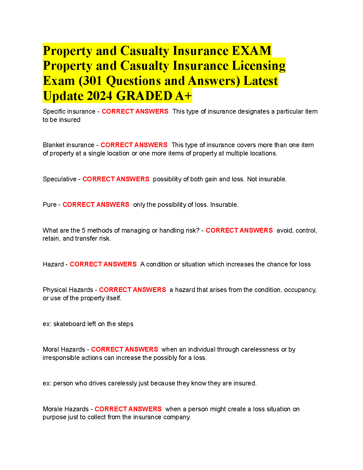 Ace your Property and Casualty Insurance Licensing Exam with this comprehensive guide featuring 301 questions and answers. Updated for the 2024-2025 academic ye...