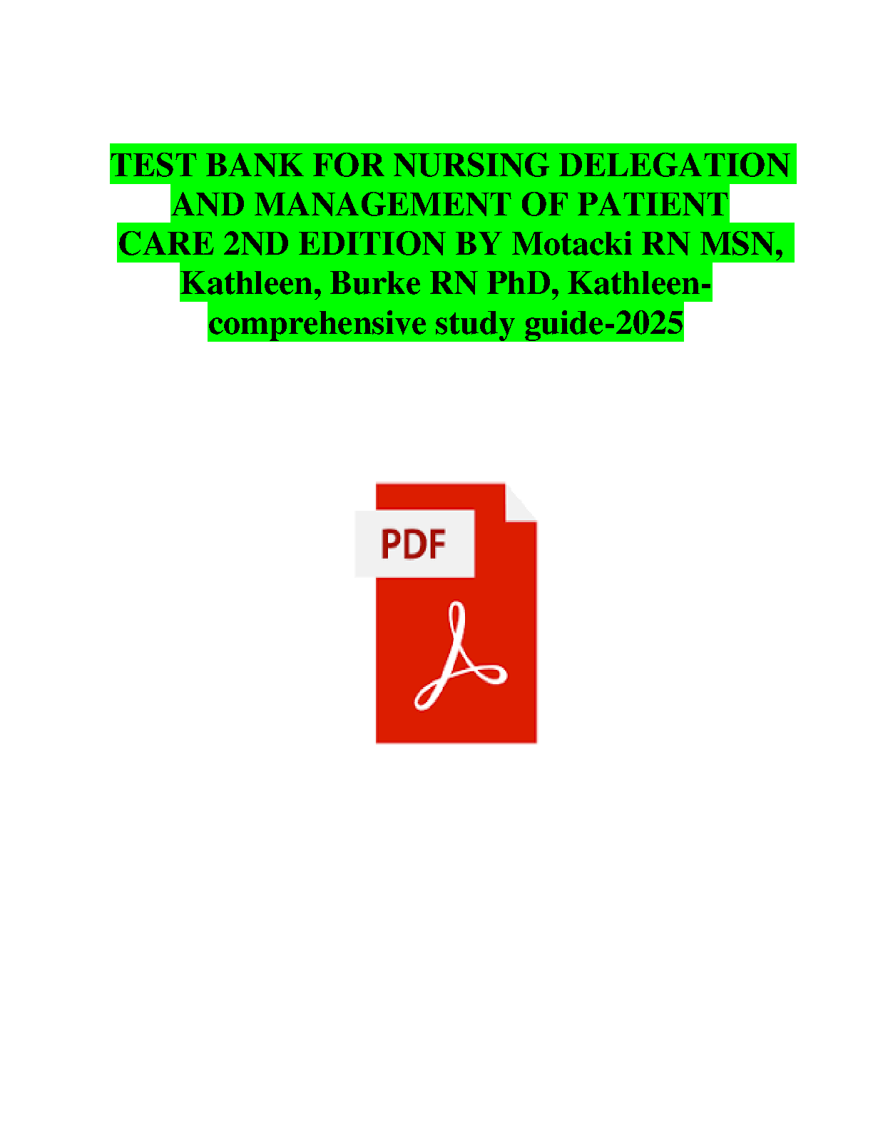 Ace your nursing exams with this comprehensive test bank for Motacki, Kathleen, and Burke's Nursing Delegation and Management of Patient Care, 2nd Edition. This 2024/2025 study guide provides in-depth practice questions to ensure first-attempt exam success and help you avoid resits. Master key concepts and boost your confidence before exam day.