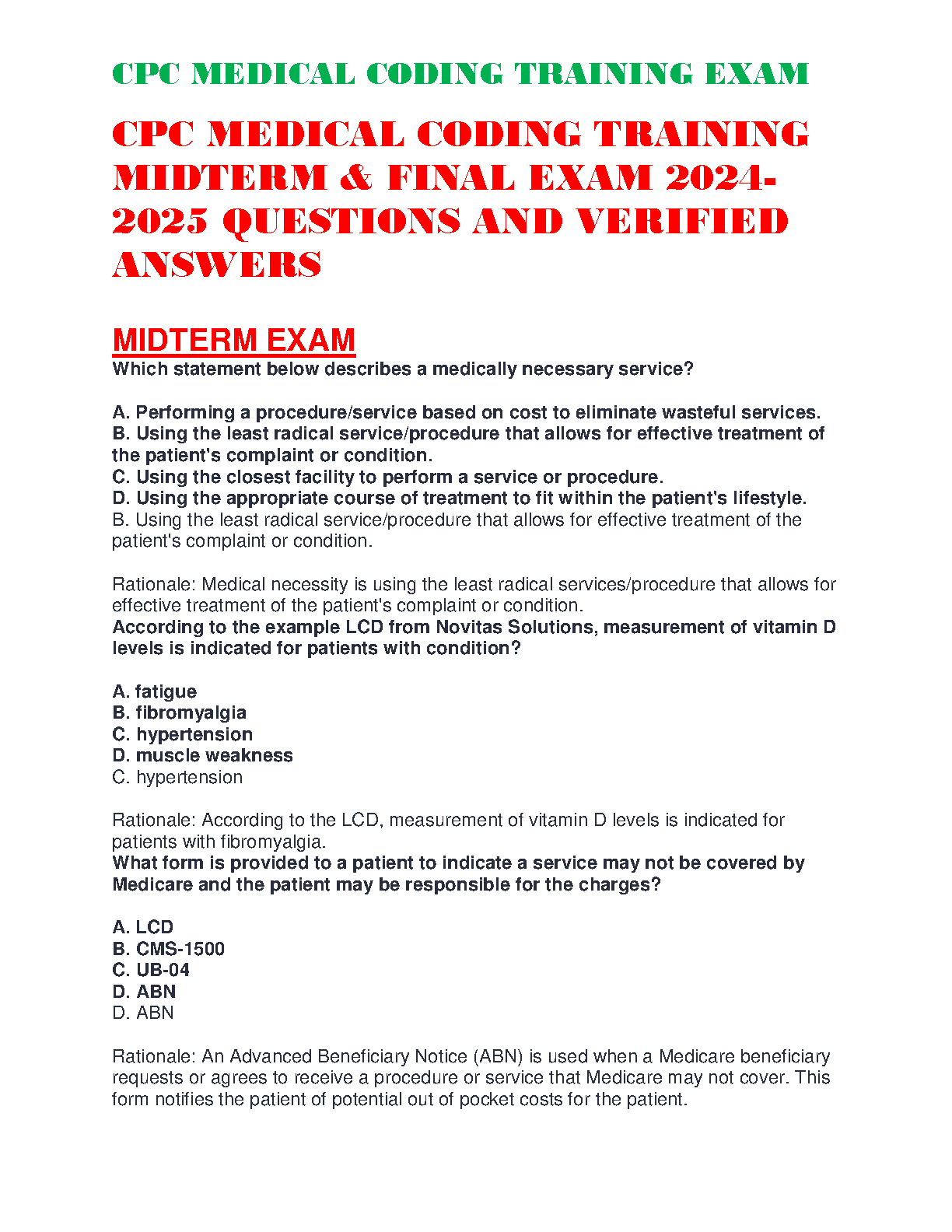 Ace your CPC Medical Coding exams with this comprehensive guide featuring 2024-2025 midterm and final exam questions and verified answers. Designed to help stud...