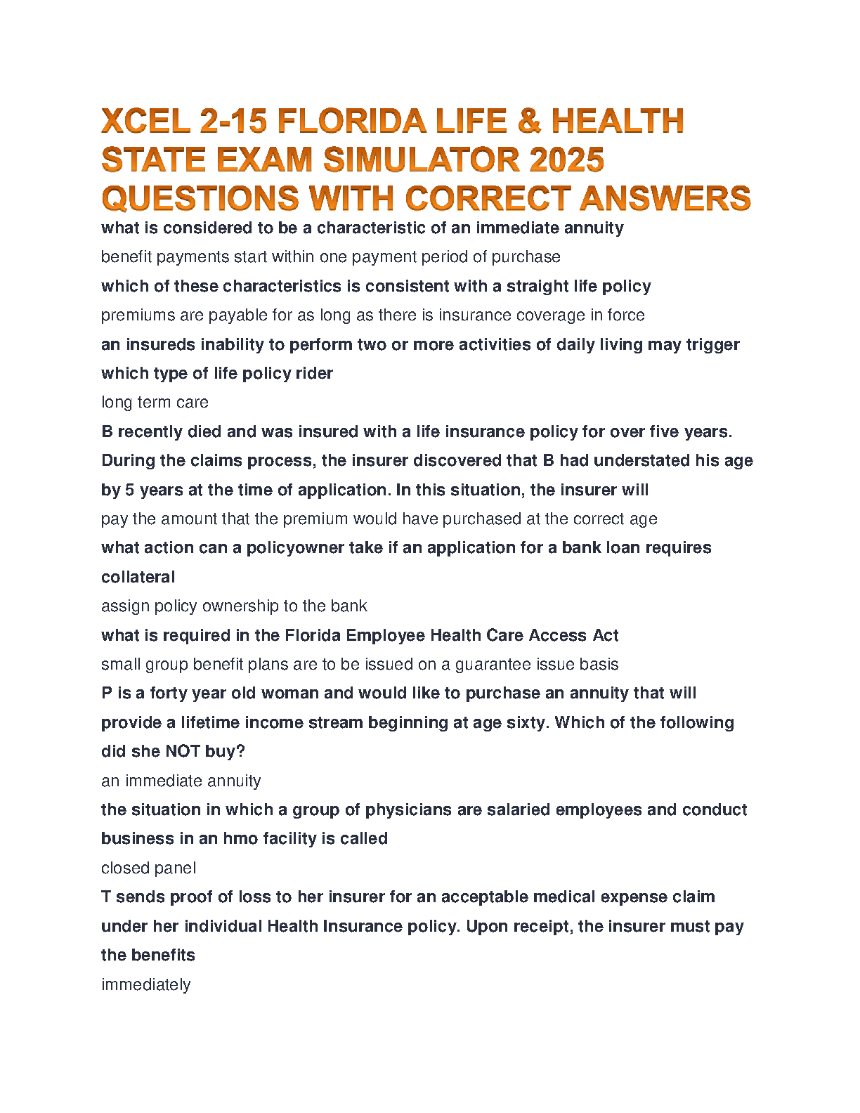XCEL 2-15 Florida Life & Health State Exam Simulator 2025: Questions with Correct Answers