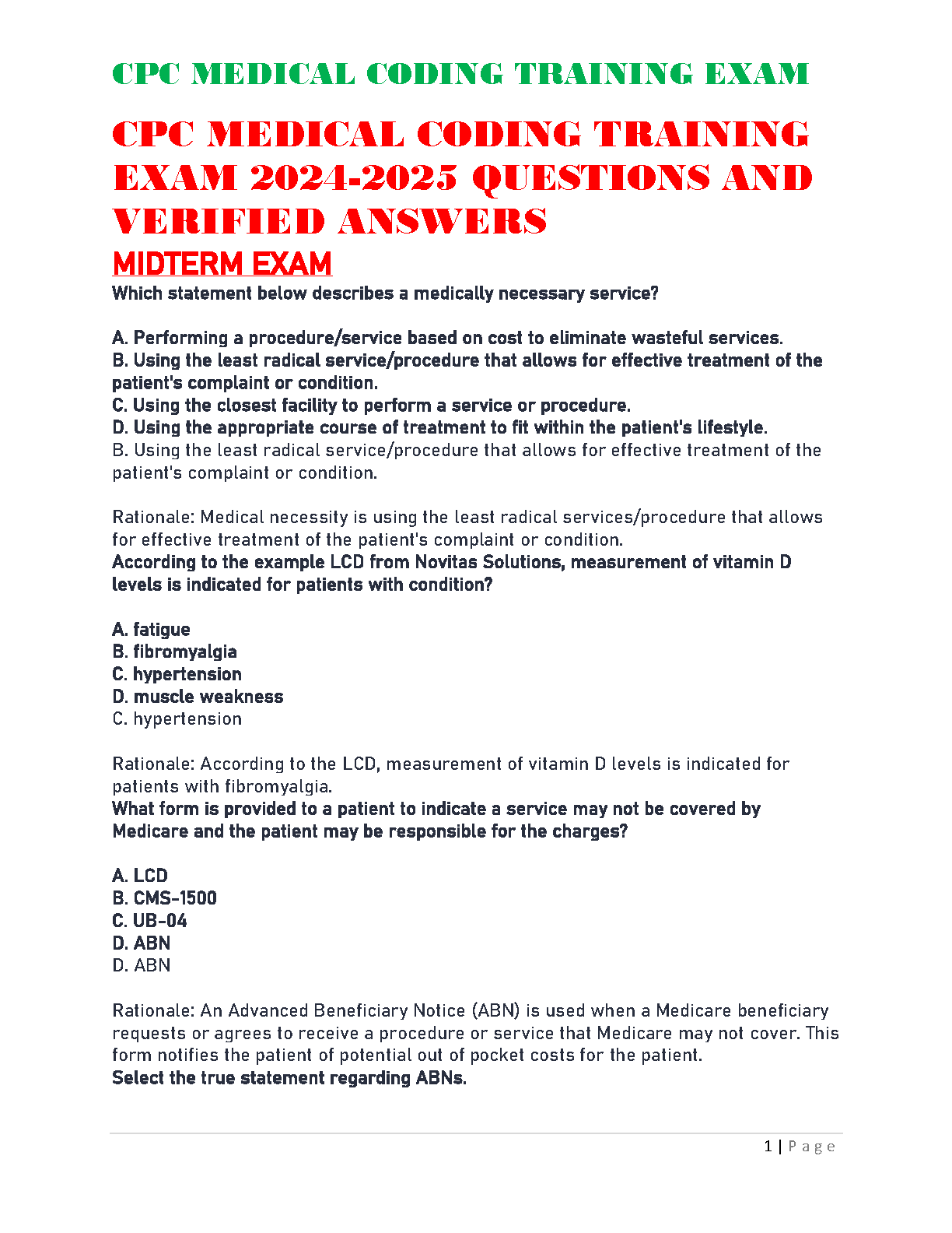 Ace your CPC Medical Coding Exam in 2024-2025 with this comprehensive midterm exam featuring verified answers. This resource is designed to help students master the material and pass their exams on the first try, avoiding costly resits. Prepare effectively and confidently for exam success!