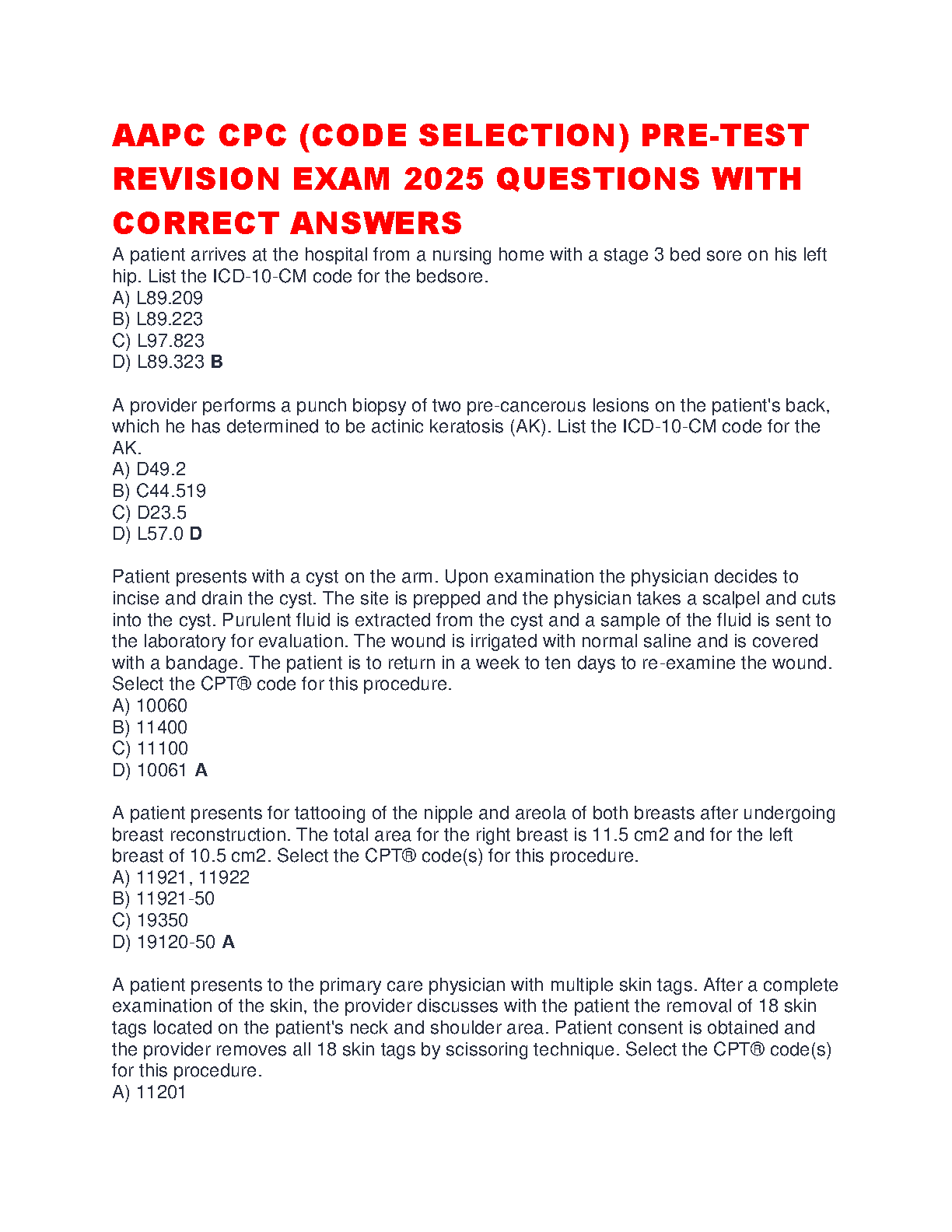 AAPC CPC Code Selection Pre-Test Revision Exam 2025 Questions with Correct Answers