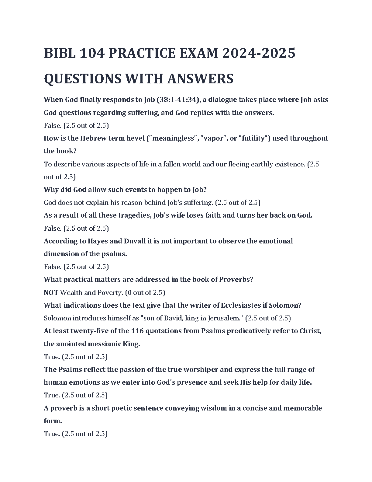 Prepare for your BIBL 104 exam with confidence using this 2024-2025 practice exam. This resource features questions with detailed answers to help you master key concepts and achieve exam success on your first attempt. Covering essential topics from the course, this comprehensive guide provides the knowledge you need to avoid resits and excel in your studies.