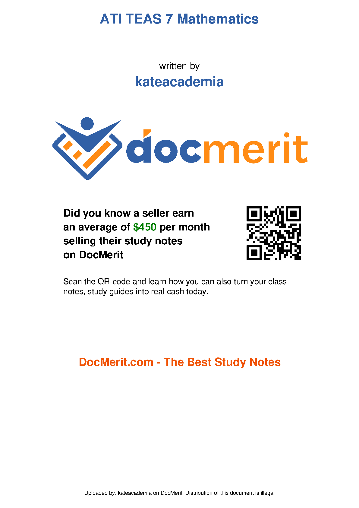 Conquer the ATI TEAS 7 Mathematics exam with this comprehensive study guide by Kateacademia. Designed to help you pass on your first try and avoid resits, this...