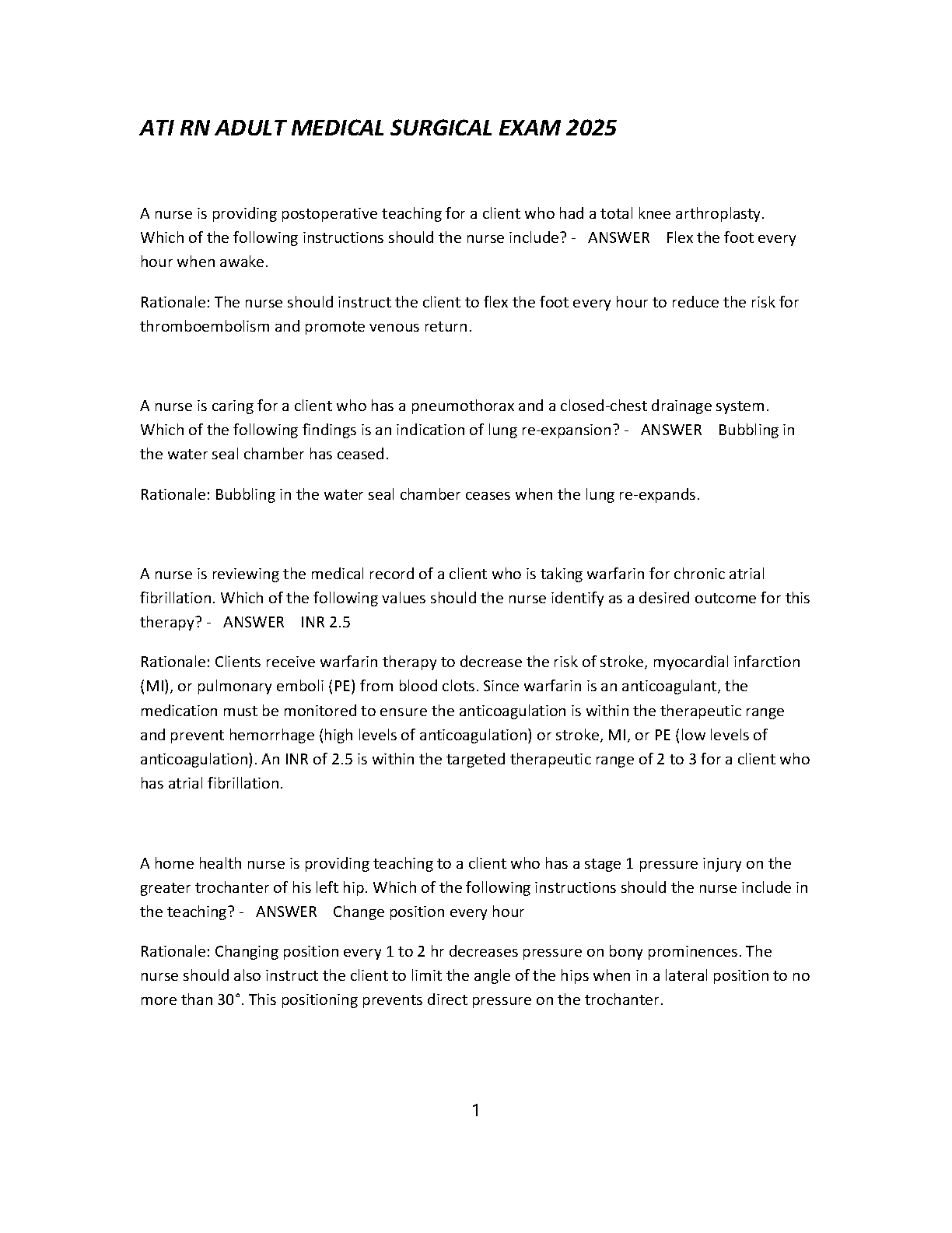 Ace your ATI RN Adult Medical Surgical Exam in 2024/2025 with this comprehensive study guide. This resource contains practice questions and answers designed to help you pass your exam on the first try, avoiding costly resits. Prepare effectively and confidently for success!