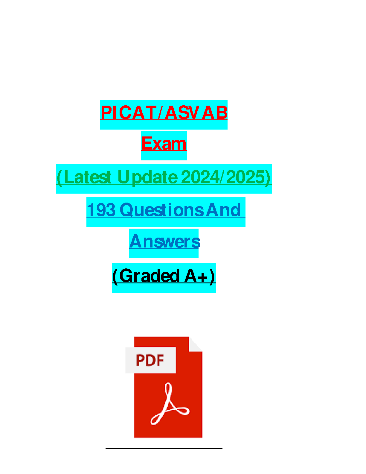 Ace your PICAT/ASVAB exam on your first try with this comprehensive study guide. This updated 2024/2025 edition features 193 questions and answers, all graded A+, ensuring you're well-prepared for exam success and avoiding resits. Download the PDF and boost your confidence for a high score.