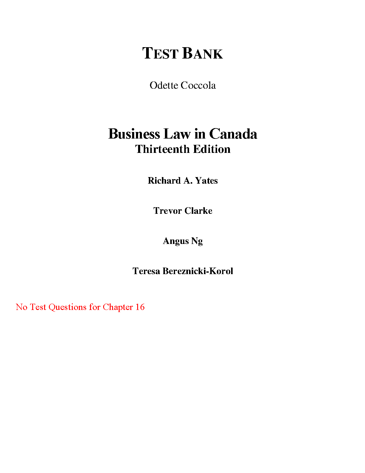 Test Bank for Business Law in Canada, 13th Edition by Richard A. Yates, Trevor Clarke, Angus Ng, and Teresa Bereznicki-Korol