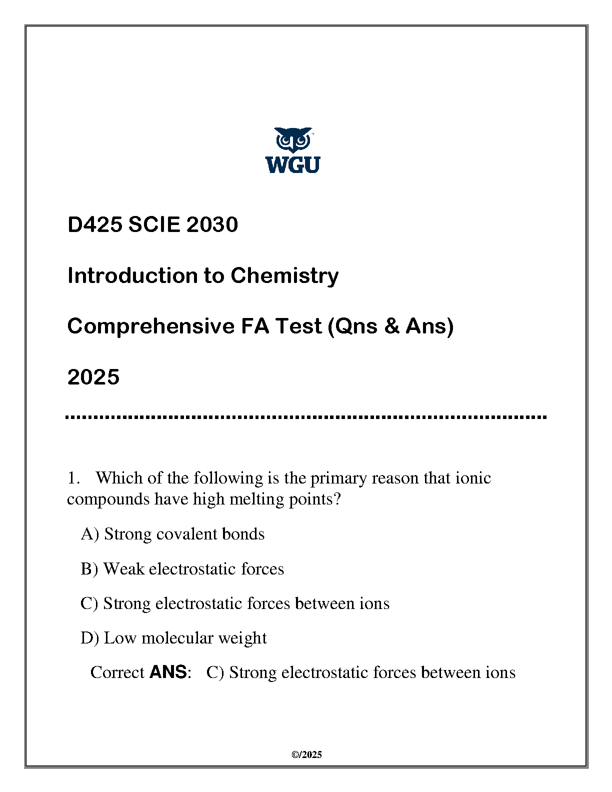 Ace your WGU SCIE 2030 Introduction to Chemistry exam with this comprehensive 2025 edition test bank. This resource contains questions and answers to help stude...