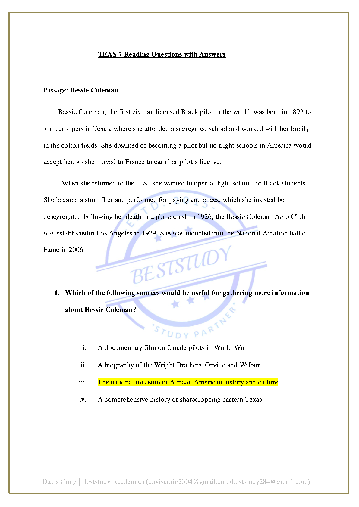Prepare for the TEAS 7 exam with this comprehensive set of reading questions and answers featuring Bessie Coleman. Master the material and ace your exam on the...