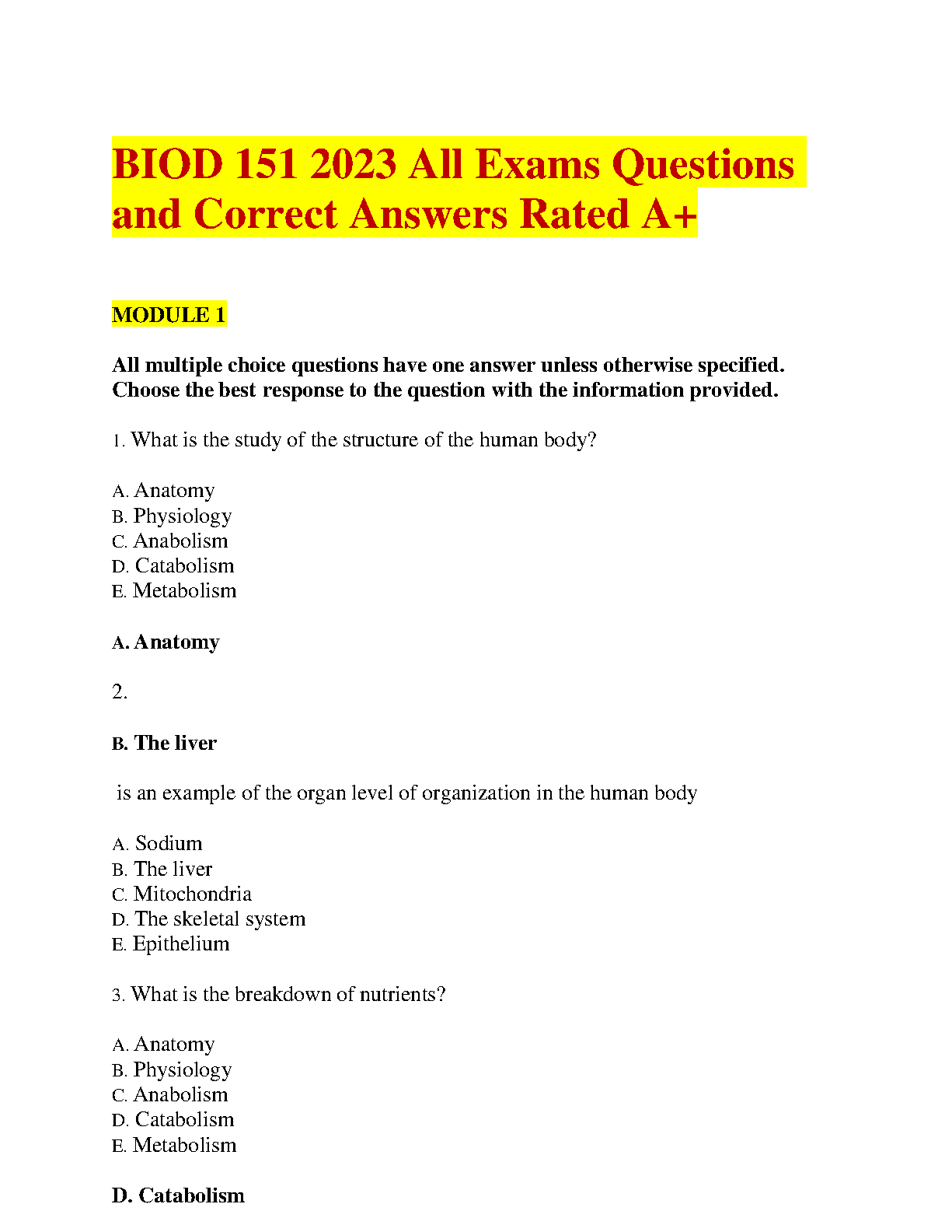 This resource contains all exam questions and answers for BIOD 151 from 2023, designed to help students achieve an A+ grade and pass their exams on the first tr...