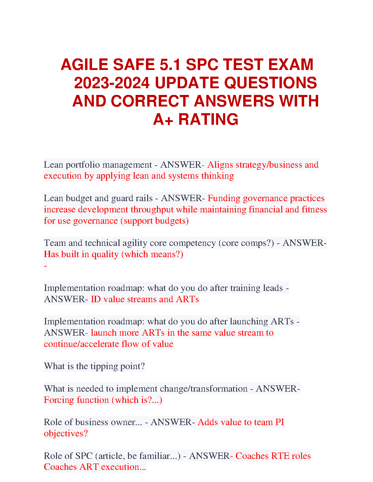 2023-2024 Agile SAFe 5.1 SPC Test Exam: Updated Questions and Answers with A+ Rating