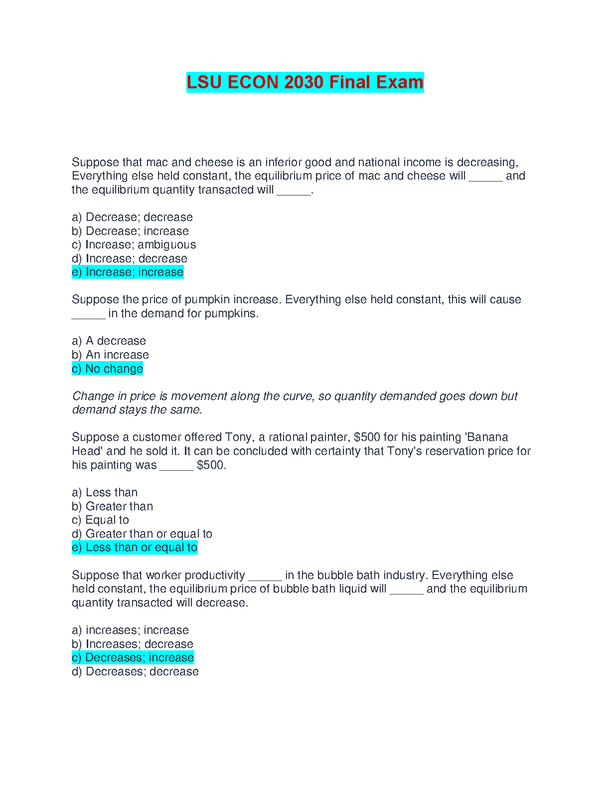 Prepare for your LSU ECON 2030 final exam with confidence. This study guide offers a thorough review of key concepts, practice questions, and solutions. Master microeconomic principles and ensure a successful outcome on your first attempt.