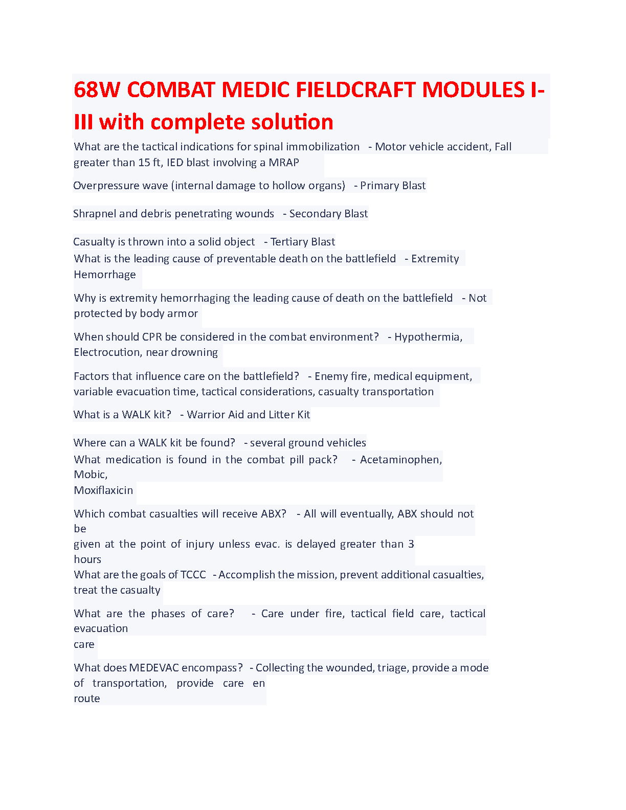 Ace your 68W Combat Medic exams on the first attempt with this comprehensive study guide. This resource covers all the essential topics from the 68W Combat Medic Fieldcraft Modules I-III, providing detailed explanations and complete solutions. Specifically designed for the 2024-2025 academic year, this guide helps you master key concepts and avoid resits.