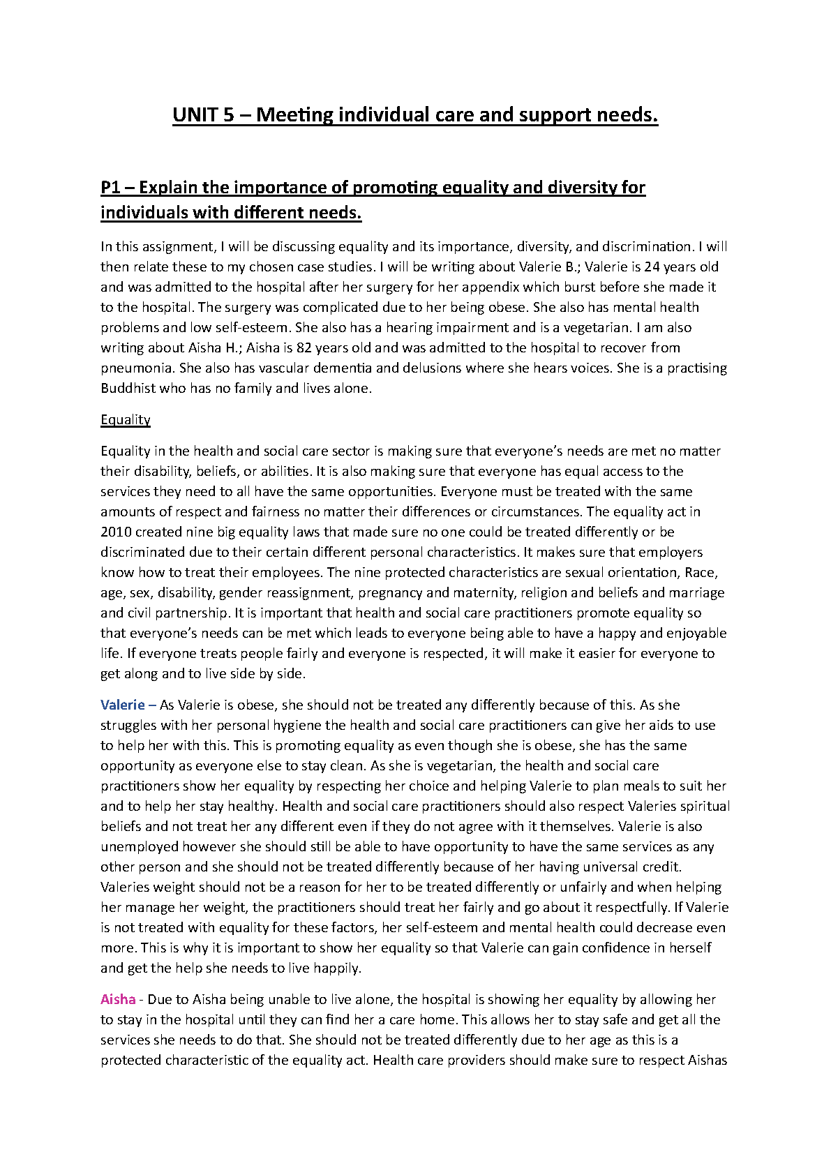 This resource explores the importance of promoting equality and diversity in healthcare settings, using real-life case studies of Valerie and Aisha to illustrate key concepts. Learn how to ensure fair and respectful treatment for individuals with diverse needs, avoiding discrimination based on protected characteristics. Ideal for students aiming to pass exams on their first attempt.