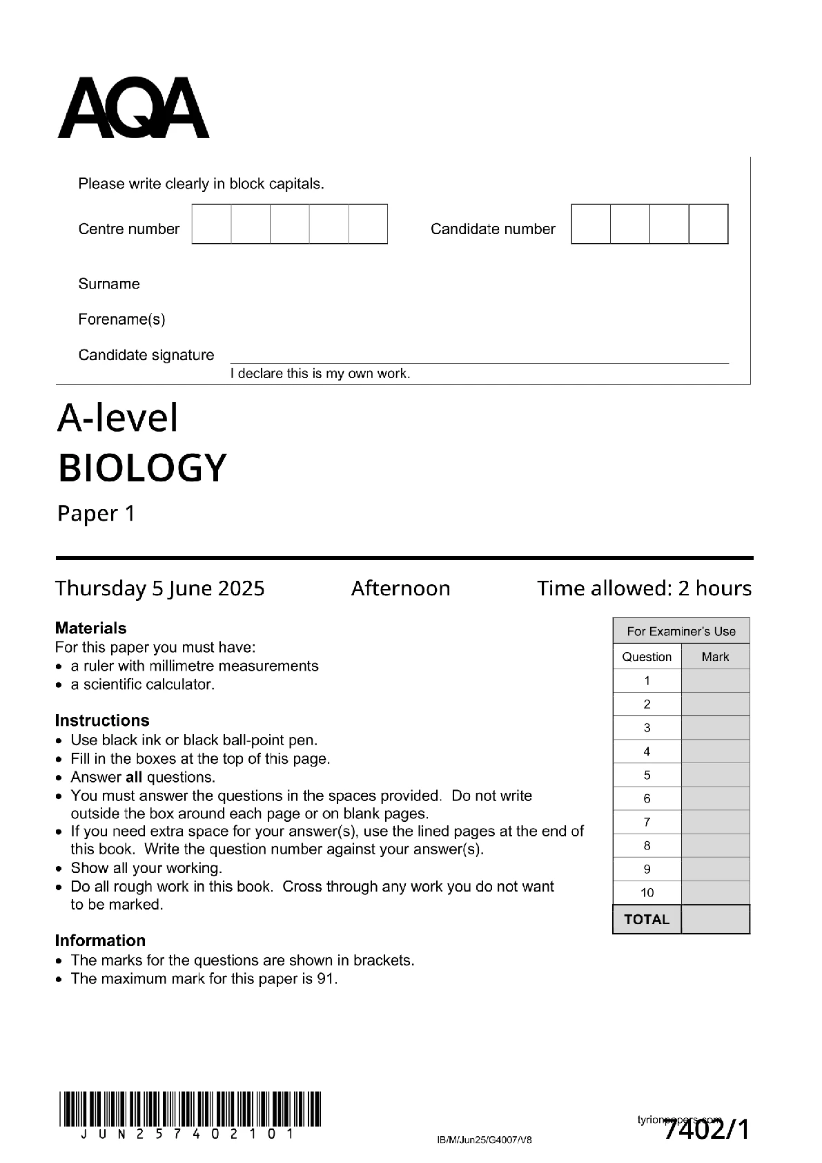 AQA A LEVEL BIOLOGY PAPER 1 QUESTION PAPER 2025 (7402/1)