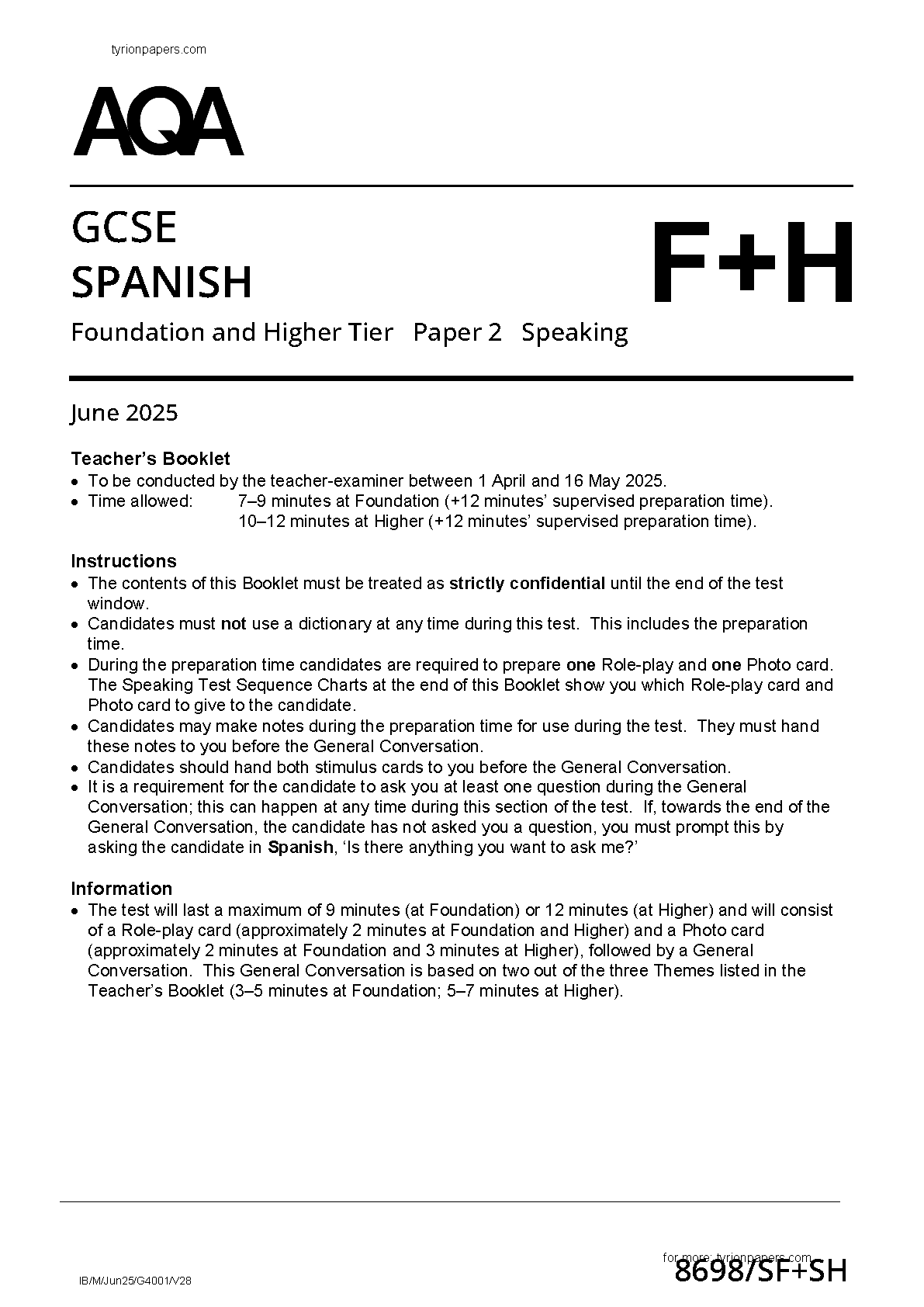 MERGED 2025 AQA GCSE SPANISH Paper 2 and Mark Scheme (8698/SF+SH: Foundation and Higher Tier)