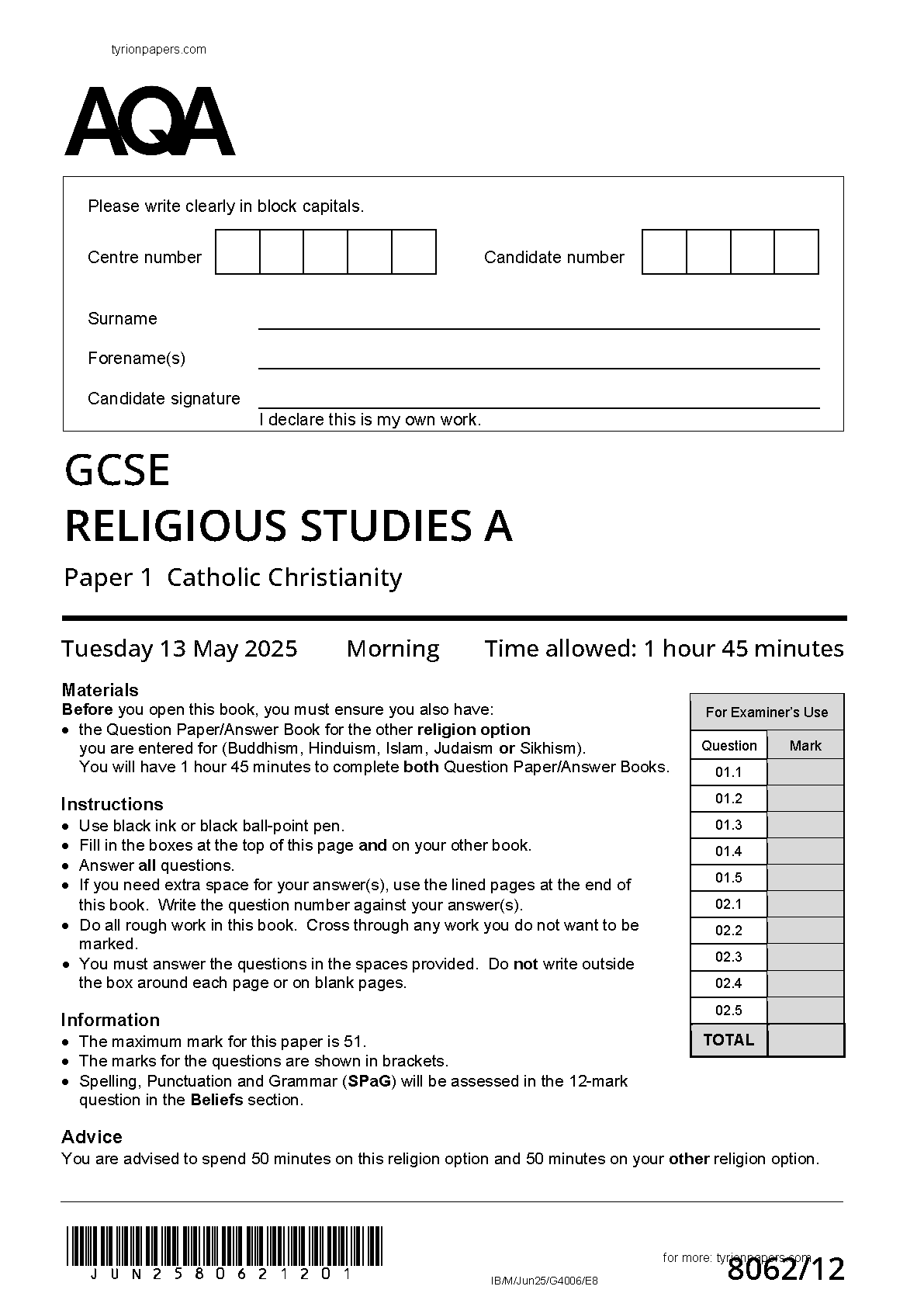 MERGED 2025 AQA GCSE RELIGIOUS STUDIES A Paper 1 Question Paper and Mark Scheme (8062/12: Catholic Christianity)