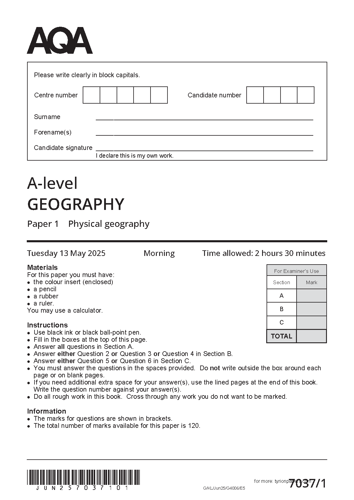 2025 AQA A Level GEOGRAPHY Paper 1 and Mark Scheme + Insert Combined (7037/1: Physical geography)